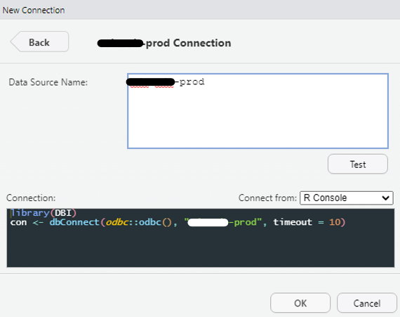 Si vous avez déjà configuré un DSN contenant vos identifiants, les informations de connexion devraient déjà être remplies, vous n’avez plus qu’à cliquer sur “OK”, et le code s’exécutera dans la console. Vous pourrez alors visualiser vos bases dans l’onglet Connections