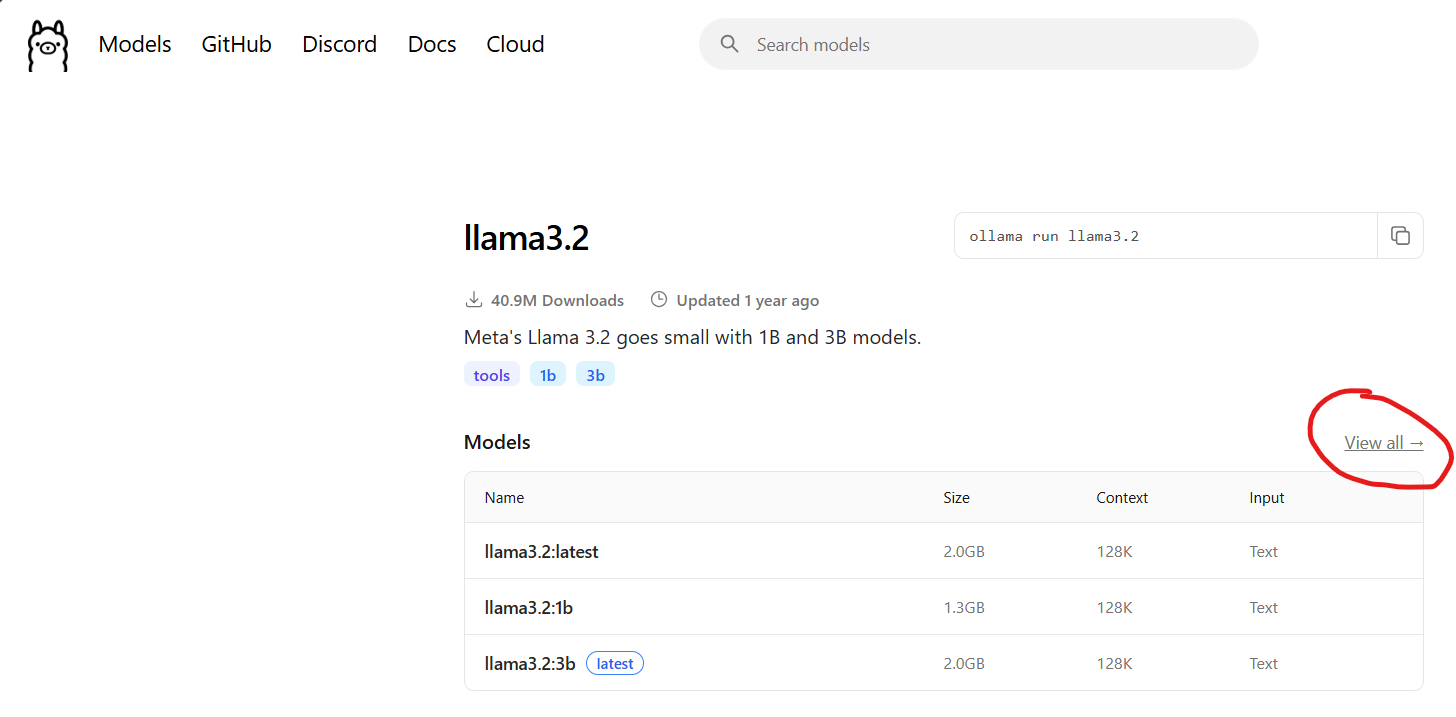Tous les modèles présents sur Ollama ne sont pas compatibles avec la RAG, il faut choisir une variante “-instruct”. Pour cela, une fois votre modèle choisi, cliquez sur “View all” pour voir toutes les variantes du modèles, et choisissez un “-instruct”.